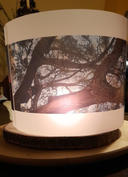 (base de madeira, rolhas de cortiça, vela e suporte em vidro, fotos da própria impressas em acetato)